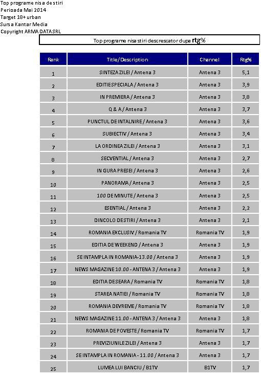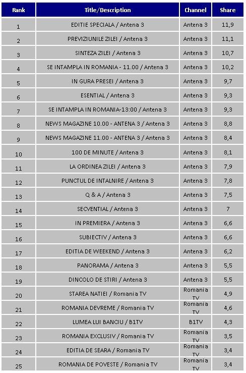În topul emisiunilor difuzate de posturile informative, producţiile Antena 3 au ocupat consecutiv primele 14 poziţii, „Sinteza zilei cu Mihai Gâdea”, „Ediţie specială”, „În premieră cu Carmen Avram”, „Q&A cu Alessandra Stoicescu” şi „Punctul de întâlnire cu Radu Tudor”, alcătuind top 5 emisiuni cu cel mai mare rating.
