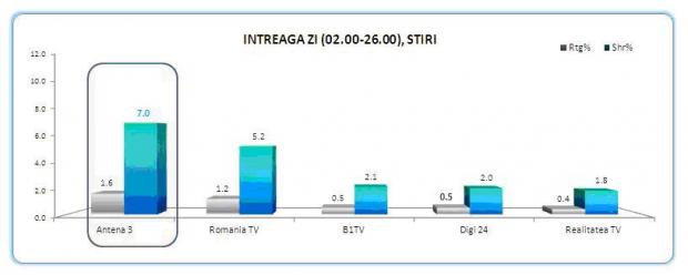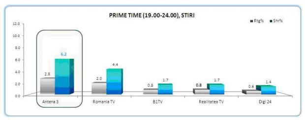 Antena 3 a condus clasamentul si seara, in cel mai disputat interval orar, unde a inregistrat 6.2% market share.
