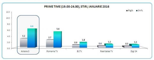 Postul de stiri al INTACT Media Group a condus acelasi clasament si in prime time, cel mai dificil interval orar, unde a inregistrat 3.2% rating si 6.6% market share.
