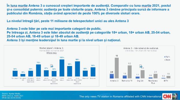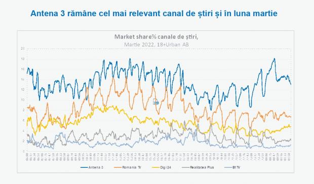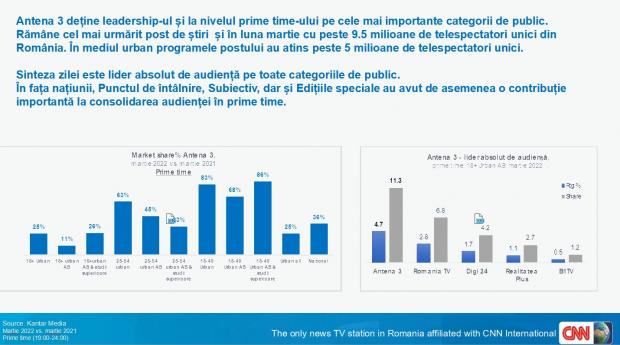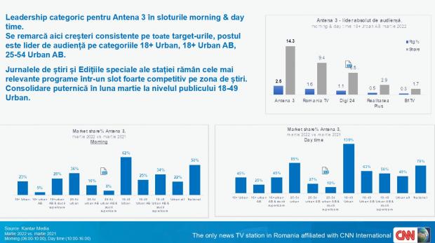 Asta înseamnă că Antena 3 și-a menținut leadership-ul în luna martie și la nivel urban și național.