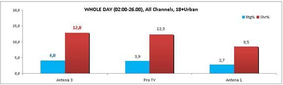 La nivelul întregii zile, Antena 3 a înregistrat o medie de 4% rating şi 12,8% cotă de piaţă, pe targetul 18+ urban, clasându-se astfel pe primul loc în clasamentul general.