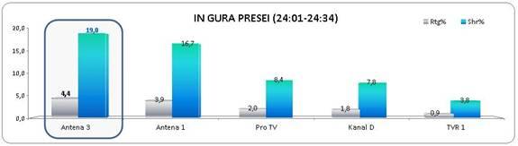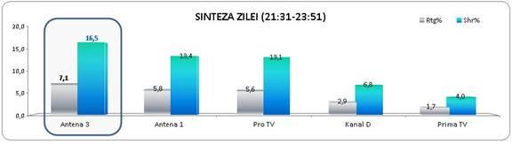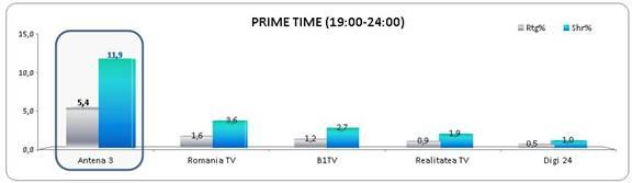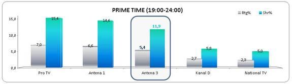 Şi în prime time, cel mai disputat interval orar, Antena 3 îşi păstrează poziţia de lider la ştiri, cu o medie de 5,4% rating şi 11,9% cotă de piaţă, o audienţă mai mult decât triplă faţă de următorul clasat, şi ocupând locul al treilea în piaţă.