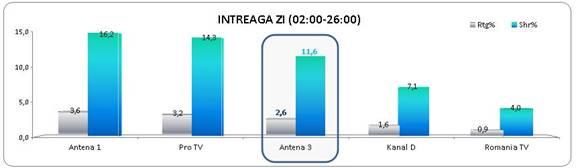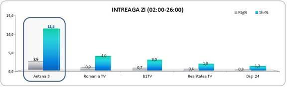 La nivelul întregii zile, Antena 3 a obţinut o medie de 2,6% rating şi 11,6% share, conducând detaşat nişa de ştiri, cu o audienţă aproape triplă faţă de următorul clasat, şi poziţionându-se pe locul al treilea în clasamentul general, după Antena 1 şi Pro TV.
