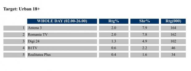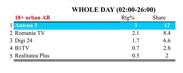 Pe durata întregii zile, pe categoria de public 18+, Antena 3 a devenit principala sursă de informare a românilor, cu o cotă de piață medie de 7,9% și două puncte de rating.