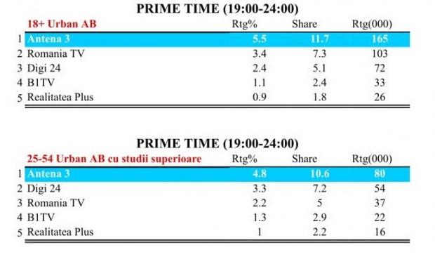 Aici putem vorbi despre o detașare netă a Antena 3 față de restul concurenței, atât pe întregul segment de public, când și în rândul românilor cu studii superioare.