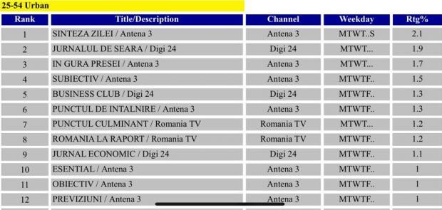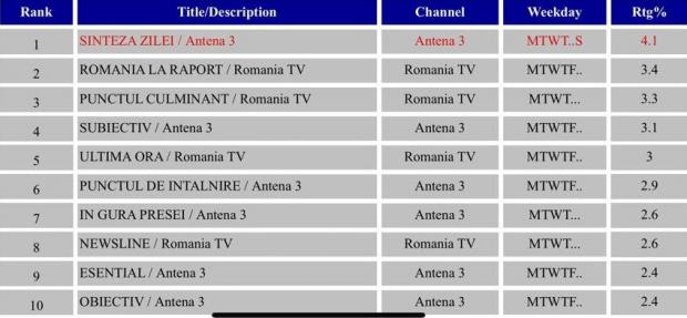 De altfel, Sinteza Zilei a fost cea mai urmărită emisiune din România în rândul posturilor de știri, potrivit datelor de audiență. În rândul publicului cu studii superioare, de exemplu, postul nostru de televiziuni își adjudecă primele patru poziții din topul emisiunilor – Sinteza Zilei, Subiectiv, În Gura Presei și Punctul de Întâlnire – la care se adaugă Obiectiv și Esențial, având astfel, în total, șase producții în top 10.