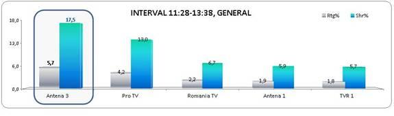 Conform cifrelor oferite de Kantar Media, pe targetul 18+ urban, în intervalul 11:28 – 13:38, când cele mai importante posturi transmiteau live ceremoniile de la Palatul Parlamentului şi Palatul Cotroceni, Antena 3 a fost lider de piaţă, cu o medie de 5,7% rating şi 17,5% cotă de piaţă, surclasând cel mai puternic post generalist, Pro TV.
