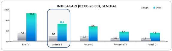 La nivelul întregii zile, Antena 3 a înregistrat o medie de 3% rating şi 10,1% cotă de piaţă, o audienţă mai mult decât dublă faţă de următorul post de ştiri clasat, şi s-a poziţionat pe locul al doilea în piaţă, după Pro TV.