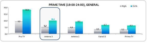 În prime time, postul nostru de ştiri a obţinut o medie de 5,2% rating şi 10,1% cotă de piaţă, ocupând aceeaşi poziţie.