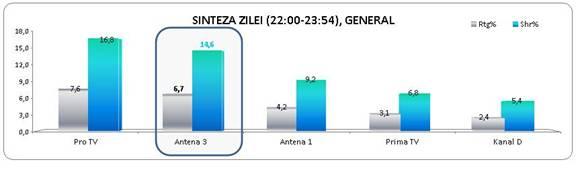 Seara, talk-show-ul „Sinteza zilei”, unde Mihai Gâdea, împreună cu invitaţii săi, au dezbătut evenimentele zilei, a înregistrat o medie de 6,7% rating şi 14,6% market share, Antena 3 clasându-se încă o dată pe locul al doilea, după Pro TV.