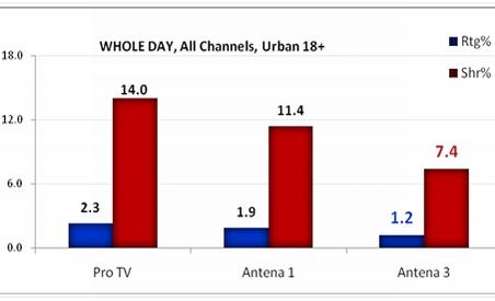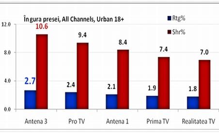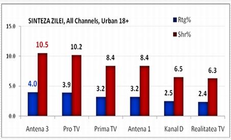 Programele propuse de Antena 3 la nivelul intregii zile au asigurat postului pozitia de lider in clasamentul televiziunilor de informatie cu o medie de 7.4% share, in timp ce in clasamentul general Antena 3 a fost depasita doar Pro Tv si Antena 1.