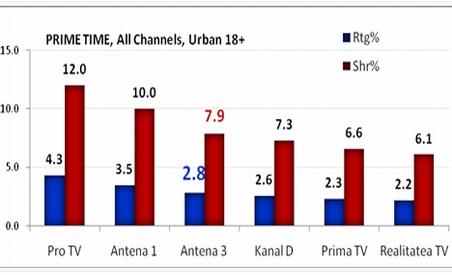 Si in prime time (19-24) Antena 3 s-a impus inca o data ca cea mai puternica televiziune de stiri, inregistrand aseara 7.9% cota de piata. Competitorul sau direct, Realitatea TV, a atins 6.1% share si a ocupat abia locul 6 in clasament, fata de locul 3 obtinut de Antena 3.