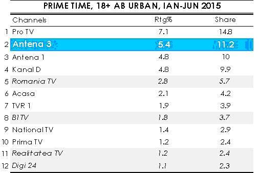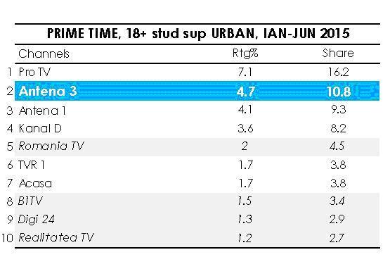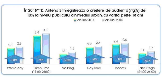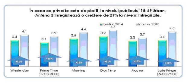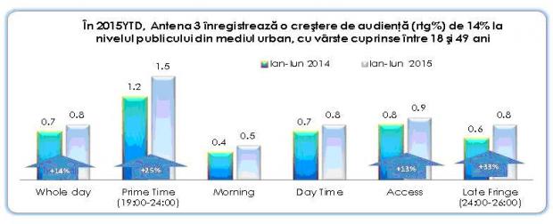 Comparativ cu primul semestru din 2014, audienta Antena 3 s-a apreciat cu 10 procente, absolut toate sloturile orare atragand mai multi telespectatori.