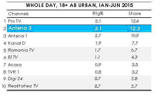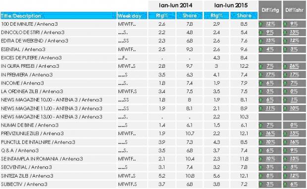 De altfel, toate emisiunile difuzate de Antena 3 in perioada ianuarie-iunie 2015 au inregistrat cresteri de audienta comparativ cu perioada similara a anului trecut.