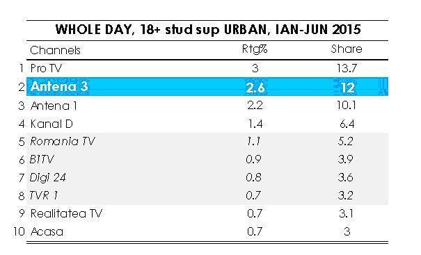 De asemenea, Antena 3 este preferata in mare masura de publicul cu studii superioare, media cotei de piata in aceasta categorie fiind de 12% pe intreaga zi si 10.8% in prime time.