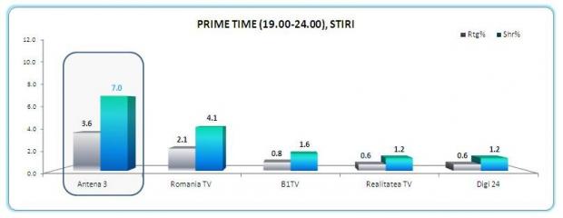 Postul de stiri al INTACT Media Group si-a pastrat pozitia de lider si in prime time, unde a inregistrat 3.6% rating si 7.0% market share.
