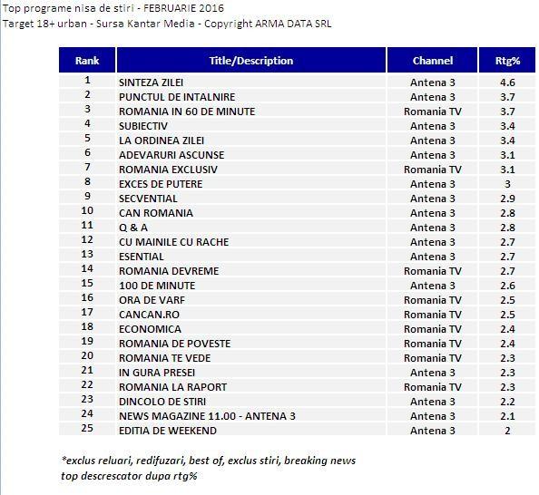 Cea mai urmarita emisiune difuzata de un post de stiri in luna februarie a fost, inca o data, “Sinteza Zilei cu Mihai Gadea”, care a obtinut o medie de 4.6 puncte de audienta. Pe locul secund s-a clasat Radu Tudor, cu “Punctul de intalnire”, si 3.7% rating.