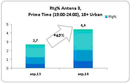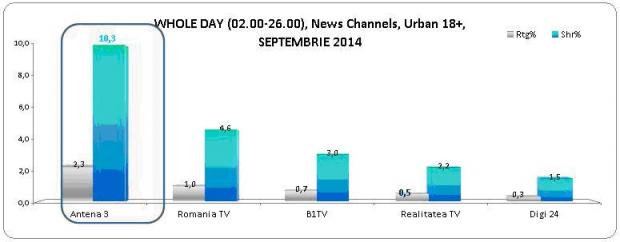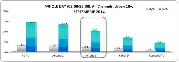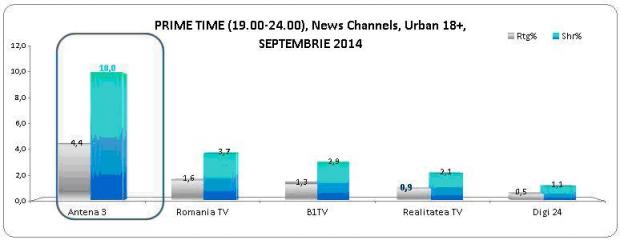 În luna septembrie, 2.785.000 de telespectatori au urmărit cel puţin un minut programele Antena 3, iar zilnic, de la începutul anului, postul de ştiri este vizionat în medie de aproximativ 3.000.000 de români.