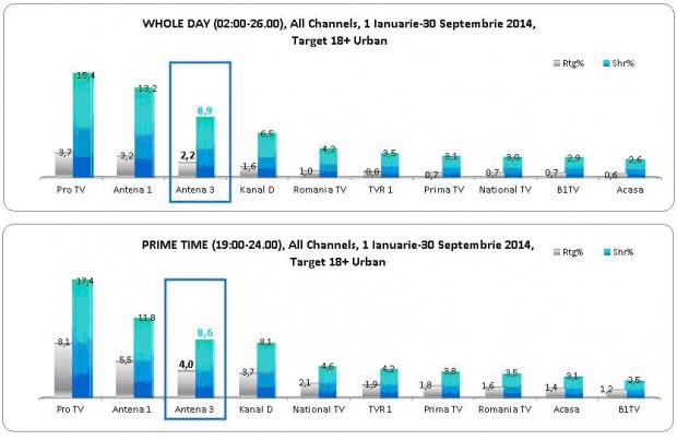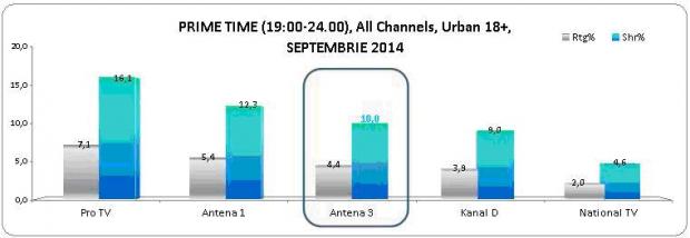 În cel mai disputat interval orar, Antena 3 şi-a consolidat avansul faţă de concurenţii direcţi, cu o medie de 4,4% rating şi 10% share, televiziunea de nişă ocupând şi locul 3 în clasamentul tuturor posturilor TV din România, imediat după cele mai puternice generaliste.