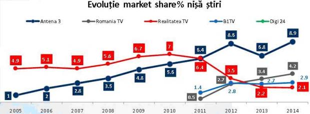 Antena 3 este un jucător foarte important pe piața TV din România, cu o medie a cotei de piaţă de 8,9%, pe întreaga zi, şi 8,6%, în prime time, înregistrată în perioada ianuarie - septembrie, performanţă care poziţionează televiziunea de nisă pe locul 3 la nivelul întregii piețe, după Pro TV și Antena 1.