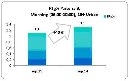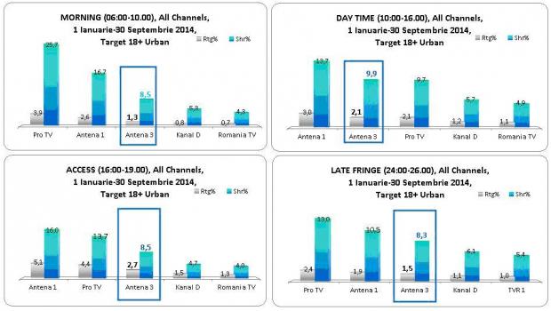 Comparativ cu luna septembrie 2013, absolut toate tronsoanele orare au înregistrat creşteri de audienţă. Astfel, dimineaţa, în intervalul orar 6-10, când Nadina Câmpean, Marius Ioniţă şi Ela Crăciun îi întâmpină pe telespectatori cu „Ştirile dimineţii”, respectiv Ştirile de weekend şi „Numai de bine”, ratingul postului a crescut cu 18%, faţă de aceeaşi lună a anului trecut.