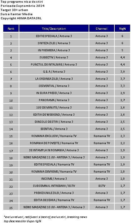 Încă de la începutul anului, Antena 3 domină piaţa talk show-urilor şi a dezbaterilor politico-sociale. În top 25 de programe difuzate de canalele de ştiri, Antena 3 este prezentă cu 19 producţii. În luna septembrie, top 5 programe cu cel mai mare rating este alcătuit din “Ediţie specială”, “Sinteza zilei cu Mihai Gâdea”, “În premieră cu Carmen Avram”, “Subiectiv cu Răzvan Dumitrescu” şi “Punctul de întâlnire cu Radu Tudor”.