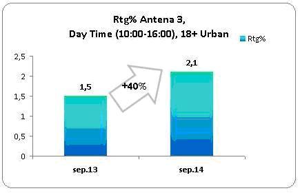 O analiză pe primele 9 luni ale anului arată că Antena 3 ocupă poziţia a treia în piaţă în fiecare tronson orar, iar în Day Time (10-16) Antena 3 chiar urcă un loc, pe poziţia a doua, după Antena 1.