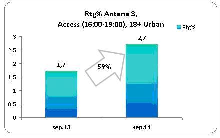 De asemenea, în intervalul 16-19 (Access), când Antena 3 difuzează „Esenţial cu Alina Petrescu” (16:00), „100 de minute cu Alessandra Stoicescu”, Ştiri 16, Ştiri 18, „Ediţie de weekend” (17:00) şi „Secvenţial cu Adrian Ursu”, audienţa a crescut cu 59 de procente.
