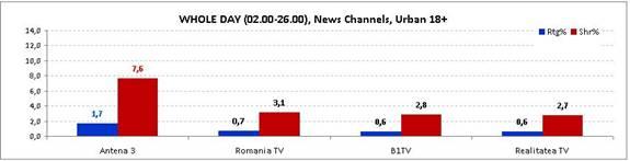 La nivelul întregii zile, postul de nişă a obţinut o medie de 1,7% rating şi 7,6% share, pe targetul 18+ urban, clasându-se pe primul loc în topul televiziunilor de ştiri din România.