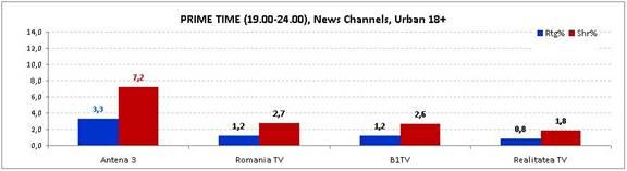 Şi în prime time s-au produs creşteri, ratingul a urcat cu 27%, de la o medie 2,6% la 3,3%, iar share-ul cu 7%, de la 6,7% la 7,2%.