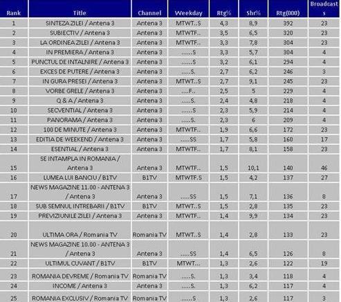 În topul emisiunilor difuzate de posturile de ştiri, primele 15 poziţii sunt ocupate consecutiv de producţii ale Antenei 3, primele cinci clasate fiind Sinteza Zilei cu Mihai Gâdea, Subiectiv cu Răzvan Dumitrescu, La ordinea zilei cu Dana Grecu şi Radu Tudor, În Premieră cu Carmen Avram şi Punctul de întâlnire cu Radu Tudor.