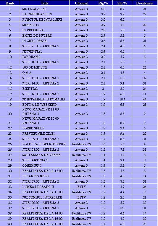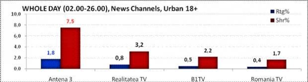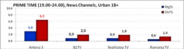 Cu o medie de 7.5% cotă de piaţă la nivelul întregii zile, Antena 3 s-a clasat pe cea mai înaltă poziţie în clasamentul televiziunilor de ştiri din România, la nivelul publicului din mediul urban, în vârstă de peste 18 ani. Următorul clasat se situează la o distanţă considerabilă, cu o medie de numai 3.2% share.