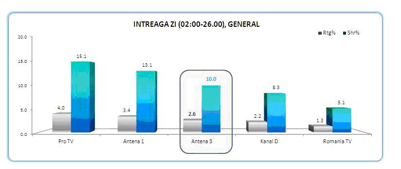 Conform cifrelor oferite de Kantar Media, Antena 3 a ocupat locul 3 in piata la nivelul intregii zile, dupa puternicele PRO Tv si Antena 1, si cu o audienta dubla fata de urmatorul post de stiri din clasament. Mediile in luna martie sunt de 2.6 puncte rating si 10 % market share.