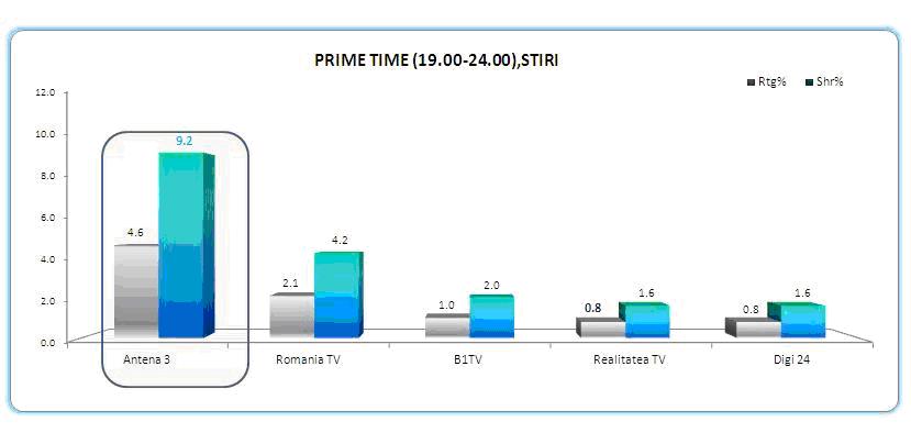 Antena 3 si-a pastrat avansul si in prime time, inregistrand 4.6% rating si 9.2% cota de piata.