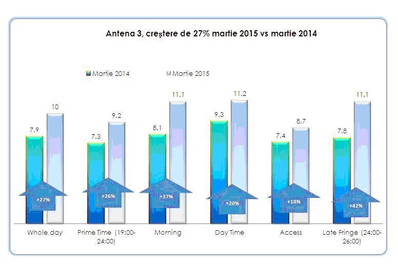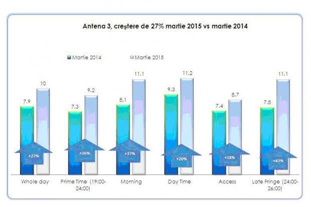 Comparativ cu luna martie 2014, Antena 3 a inregistrat cresteri de audienta pe absolut toate sloturile orare, cea mai importanta fiind cea din segmentul Late Fringe, cand se difuzeaza emisiunea realizata de catre Mircea Badea si Stirile noptii.