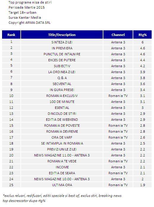 In ierarhia celor mai urmărite emisiuni difuzate de posturile de ştiri, Antena 3 a condus detaşat, „Sinteza zilei cu Mihai Gâdea”, „In premiera cu Carmen Avram”, “Punctul de întâlnire cu Radu Tudor”, “Exces de putere cu Oana Stancu si Adrian Ursu” si „Subiectiv cu Răzvan Dumitrescu” alcătuind top 5 programe cu cel mai mare rating.