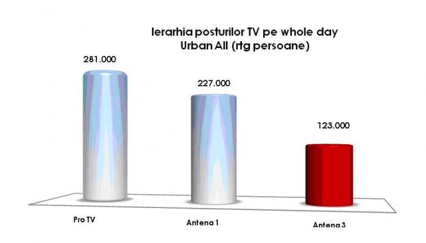 Clasamentul este acelasi si la nivelul publicului “all urban”, unde postul de stiri parte a Intact Media Group ocupa pozitia a treia atat pe intreaga zi cu 6.3% cota de piata, cat si in prime time cu 6.5% share.