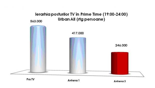 Antena 3 isi pastreaza aceeasi pozitie pe podium si in prime time, in intervalul orar 19-24, unde obtine o medie de 2.4% rating si 6.9% cota de piata. Acest loc 3 atat in prime time, cat si pe intreaga zi, este cea mai bună performanta a Antenei 3 de la lansare pana in prezent.