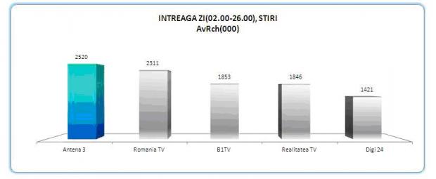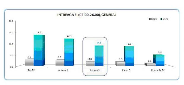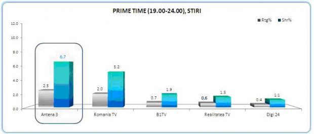 Antena 3 si-a pastrat locul intai si in prime time, unde a inregistrat 2.5% rating si 6.7% cota de piata, conducand astfel clasamentul televiziunilor informative.