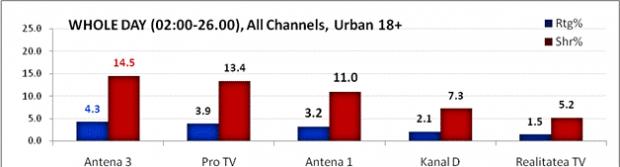 Conform Kantar Media, Antena 3 a fost cea mai urmărită televiziune din România la nivelul întregii zile, cu o medie de 14.5% cotă de piaţă şi 4.3 puncte rating în rândul publicului din mediul urban, de peste 18 ani.