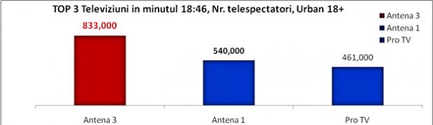 Vârful de audienţă a fost înregistrat la ora 18:46, în timpul ediţiei speciale a emisiunii 100 de minute cu Alessandra Stoicescu şi Radu Tudor, cu Victor Ciutacu invitat în studio. Antena 3 a atins atunci 9.0% rating şi 18.6% market share, ceea ce înseamnă că nu mai puţin de 833.000 de telespectatori urmăreau postul de nişă.