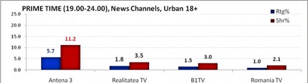 În ceea ce priveşte clasamentul televiziunilor de ştiri, Antena 3 a fost lider detaşat, situându-se la distanţă considerabilă de concurenţă atât pe întreaga zi cât şi în prime time, când s-a difuzat şi emisiunea Subiectiv cu Răzvan Dumitrescu. Postul informativ a obţinut în cel mai disputat interval orar o medie de 11.2% cotă de piaţă şi 5.7% rating şi s-a clasat pe locul întâi în top.