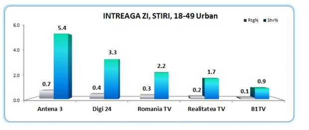 Antena 3 a repetat aceste performante si pe targetul commercial, cu medii de 5.4% cota de piata pe intreaga zi si 4.3% in prime time, cifre aproape duble fata de urmatorul clasat.