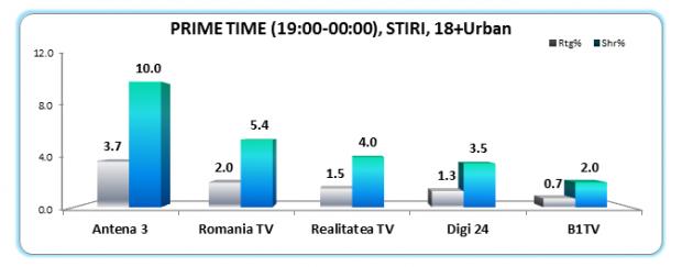 Postul nostru de stiri si-a conservat pozitia de lider detasat si seara, in prime time, unde a inregistrat o medie de 10% in randul publicului din mediul urban, in varsta de peste 18 ani.