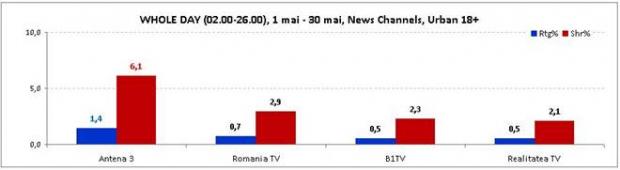 La nivelul întregii zile, Antena 3 a înregistrat o medie de 6,1% cotă de piaţă, pe targetul 18+ urban, poziţionându-se astfel pe primul loc în topul televiziunilor de ştiri, informează Kantar Media.