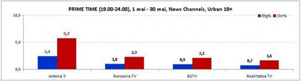 În prime time, Antena 3 a obţinut o medie de 2,4% rating şi 5,7% market share, o audienţă de trei ori mai mare faţă de următorul competitor.