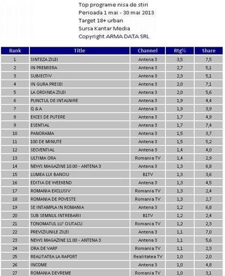 Topul emisiunilor difuzate de posturile de ştiri este dominat de Antena 3, primele cinci clasate fiind „Sinteza zilei cu Mihai Gâdea”, „În premieră cu Carmen Avram”, „Subiectiv cu Răzvan Dumitrescu”, „În gura presei cu Mircea Badea” şi „La ordinea zilei cu Dana Grecu şi Radu Tudor”.