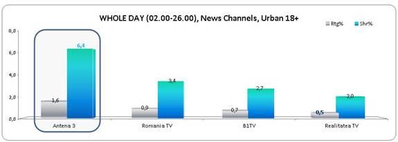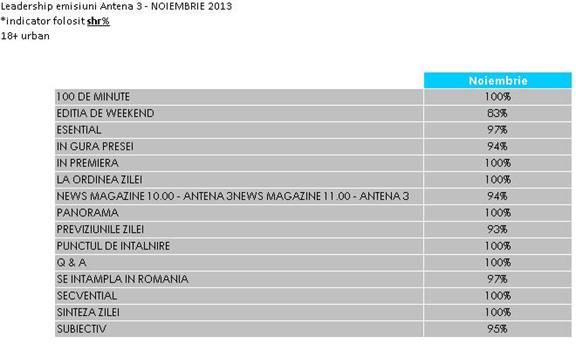 De asemenea, cele mai multe producţii ale Antena 3, precum „100 de minute cu Alessandra Stoicescu”, „Panorama cu Oana Stănciulescu” şi „Secvenţial cu Adrian Ursu”, au câştigat competiţia cu programele concurente în proporţie de 100% (leadership).