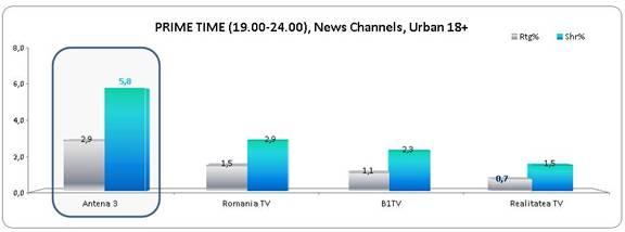 În prime time, clasamentul rămâne acelaşi, Antena 3 obţinând o medie de 2,9% rating şi 5,8% share, audienţă dublă faţă de următorul clasat.