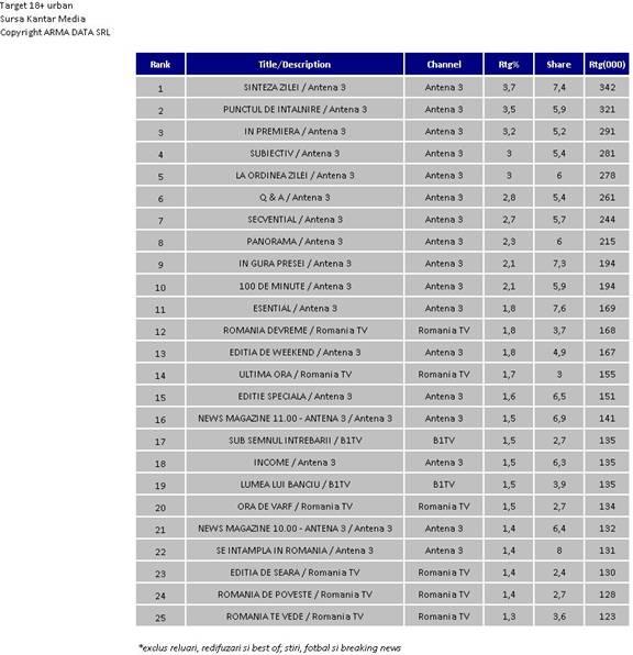 În topul emisiunilor difuzate de către toate televiziunile informative, producţiile Antena 3 au ocupat consecutiv primele 11 poziţii, „Sinteza zilei cu Mihai Gâdea”, „Punctul de întâlnire cu Radu Tudor”, „În premieră cu Carmen Avram”, „Subiectiv cu Răzvan Dumitrescu” şi „La ordinea zilei cu Dana Grecu şi Radu Tudor” ocupând primele cinci poziţii.
